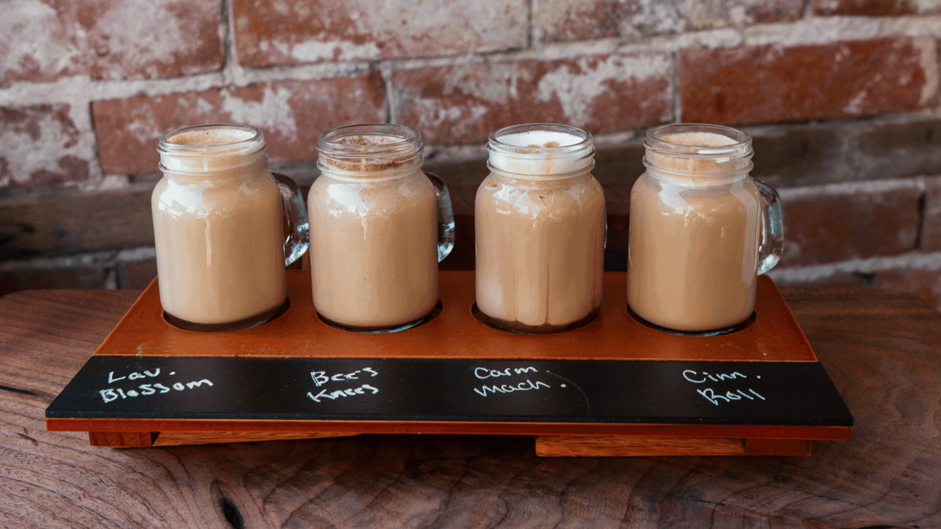 The Latte Flight — Lavender Blossom • Bee’s Knees • Caramel Macchiato • Cinnamon Roll Latte