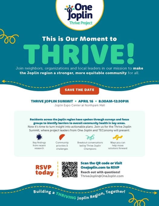 Community leaders, volunteers, and anyone passionate about making a difference are invited to the Thrive Joplin Summit, hosted by One Joplin. This collaborative event will bring together voices from across Joplin, Webb City, Carterville, and Carl Junction to focus on long-term solutions for improving health, well-being, and quality of life in the region.